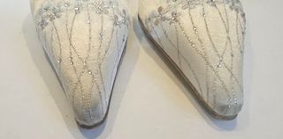 Elegantes zapatos de novia con un diseño delicado y adornos. - Adornados con pedrería y flores. - Cierre de pulsera al tobillo. - tacón de 7cm - exterior en tejido,interior plantilla de piel. - solo puesto el dia de la boda. - me costaron 95 euros nuevo - en las puntas de los dos zapatos esta un poco oscuro pero muy poquito. - son muy comodos de llevar