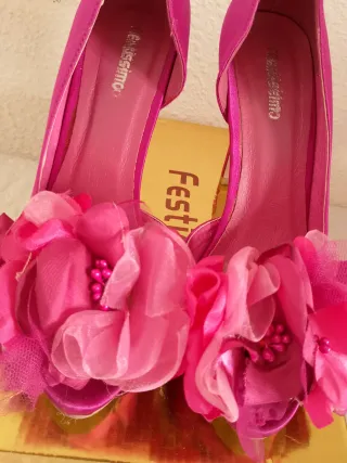Elegantes zapatos de tacón alto, perfectos para ocasiones especiales. - Diseño abierto en la punta. - Adornados con flores y detalles de tul. - Tacón fino y estilizado.
