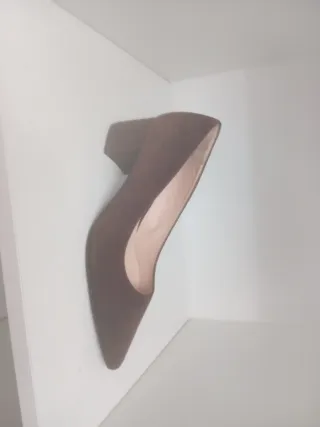 Elegante zapato de ante marrón, talla 35, a estrenar. - Material exterior de ante. - Detalle interior en piel. - Tacón cuadrado y robusto.