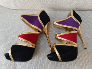Elegantes zapatos de tacón con un diseño llamativo y moderno. - Combinación de colores vibrantes. - Acabado metálico dorado en los detalles. - Diseño abierto tipo sandalia.
