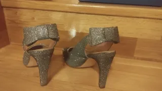 Elegantes zapatos de tacón con un acabado brillante. Usados 1 vez - Diseño slingback con detalle de lazo. - Adorno de purpurina en toda la superficie.