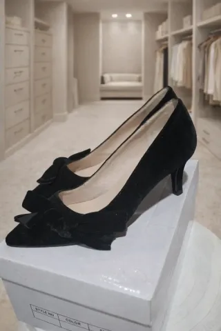 Elegantes zapatos de tacón negros, usados una sola vez. - Diseño de punta fina. - Detalle de puntadas decorativas en el borde. - Pequeño lazo en la parte delantera.