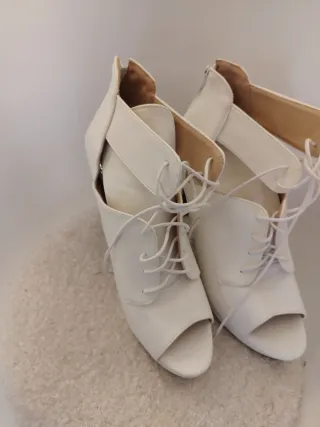 Elegantes zapatos de tacón blancos, perfectos para cualquier ocasión. - Diseño abierto en la punta. - Cierre con cordones y cremallera trasera. - Plataforma delantera para mayor comodidad. - Tacón grueso y estable.