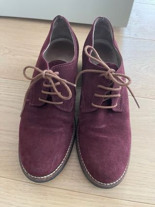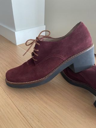 Zapatos de piel con cordones color burdeos. Muy poco uso. - Material exterior de piel/ante e interior de piel. - Tacón grueso de goma, altura 5cm.