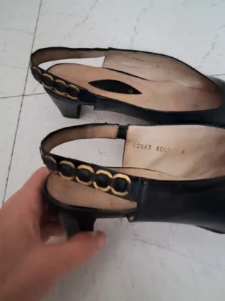 Zapatos núm. 39 de piel natural para mujer. De tacón y en color negro. Muy buen estado del zapato. Suelas iniciales de piel cambiadas a goma para que nos resbalen.