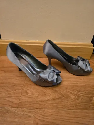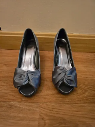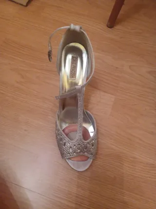 Zapatos de tacón plateados para fiesta.