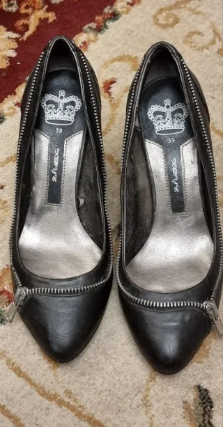 Elegantes zapatos de tacón con un diseño moderno. Cremallera al rededor que le da un toque roquero. - Material: Piel. - Detalle de cremallera decorativa. - Tacón de fino de 8 cm. La piel esta en buen estado, los tacones tienen algún roce y la plantilla interior esta pelada, pero por lo demás están muy bien porque solo los utilice en un par de ocasiones. Tienen bastantes años y la calidad de la piel es mucho mejor que la que pueden tener los artículos que vende Pull&bear en la actualidad.