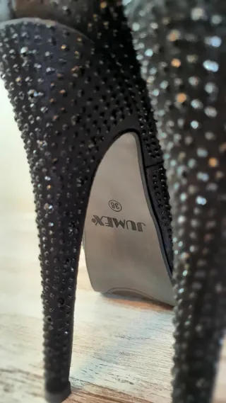 Elegantes tacones negros con plataforma y detalles brillantes. - Acabado en ante. - Adornos de pedrería en la punta. - Tacón grueso y alto.