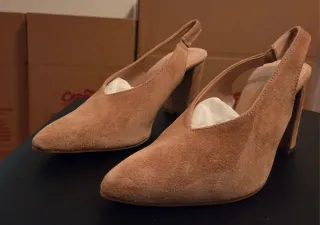 Zapatos de tacón. Un solo y corto uso - Material: Ante - Color: Beige y marrón - Tipo de tacón: Bloque
