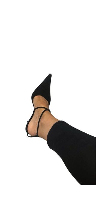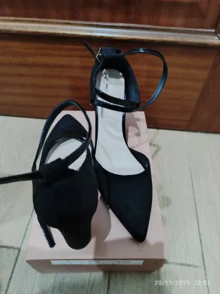 Elegantes zapatos de tacón con un diseño moderno.pone llana 35 pero realmente da un 36 actual - Material exterior de terciopelo - Detalle elástico cruzado en el empeine. - Punta fina.