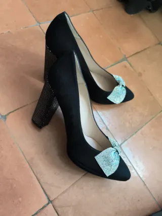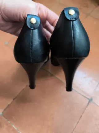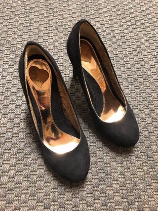 Elegantes tacones negros. - Material exterior de ante. - Interior con detalles dorados. - Diseño de corazón en la plantilla.