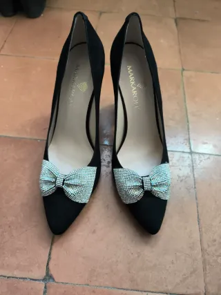 Elegantes zapatos de salón de la marca Markaroli. - Color negro. - Detalle de lazo con pedrería en la punta. - Tacón alto. De piel