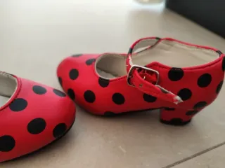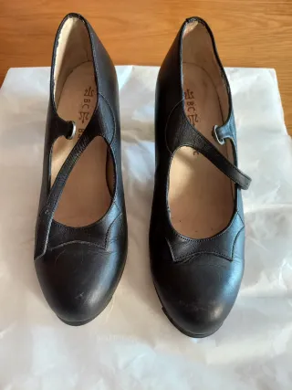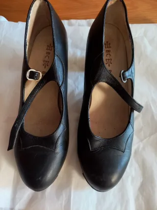 Zapatos de flamenco de cuero. Cierre con hebilla. Tacón semiprofesional. Usados muy poco. Precio original en tienda especializada en danza, 99€.