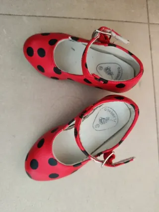 Bonitos zapatos de tacón con diseño de lunares rojos y negros. Perfectos excepto en zona de broche que se pelo un poco. Resto perfecto. Talla 24. Marca flamenco - Cierre de hebilla. - Detalle de lunares. - Tacón bajo.