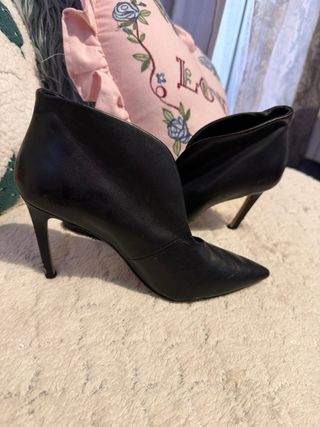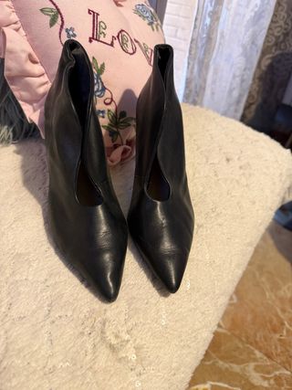 Elegantes zapatos de tacón de ante. - Diseño de punta fina. - Tacón de altura media. Con puntera fina. Plantillas de Gel. Tacón tipo stiletto. Detalle de círculo dorado en la base del tacón. Material de antelina, y suela de Caucho antideslizante. -Marca: Zara. -Composicion: Antelina, Caucho. -Color: Negro//Dorado. -Talla: 39. -Tacón: 7 cmtrs. -Estado: Muy Bueno.