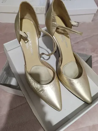 Elegantes zapatos de tacón en color dorado. Perfectos para ocasiones especiales. _ Piel exterior e interior de calidad. - Diseño de punta fina. - Correa de tobillo ajustable. - Tacón de aguja. -Plantilla interior para más comodidad.