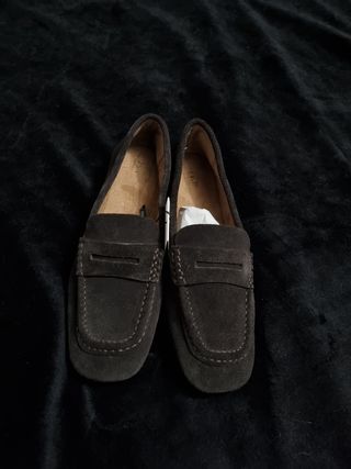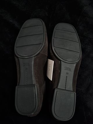 Zapatos tipo mocasín de Zara en color marrón. Perfectos para un look casual o elegante. - Material exterior de ante. - Diseño con antifaz y pespuntes. - Suela cómoda.