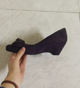 Pack tacones y bolso de terciopelo morado. Son exactamente del mismo tono, por lo que forman un buen combo. Las 2 cosas están nuevas, sin estrenar. -Tacones: marca Andrea Fittel, número 37. - Bolso: marca Tohego. Los tacones cuentan con un lacito para hacerlos más elegantes, mientras que el bolso cuenta con unos decorados en color.