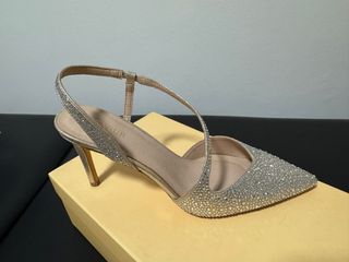 Elegantes zapatos de tacón para ocasiones especiales. - Diseño de punta fina. - Tira fina con pedrería plateada. - Cierre de hebilla. - Marca: Colour Cherie Usados un día, el de la boda