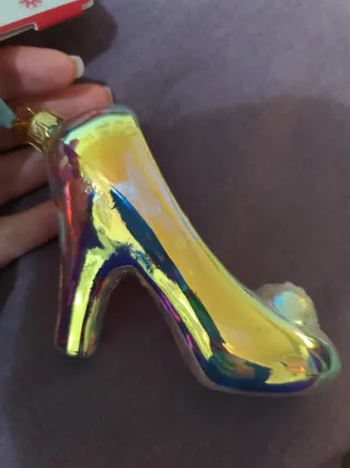 Adorno de cristal con forma de zapato de Cenicienta de Disney. Ideal para coleccionistas o como decoración. - Diseño de zapato de tacón. - Acabado iridiscente. - Detalle del nombre 'Cenicienta' en el interior. No negociable