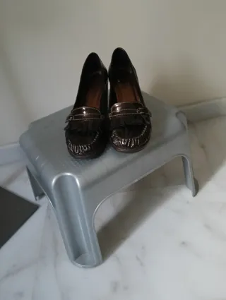 Elegantes zapatos de tacón cuña de la marca Vía Uno. - Diseño tipo mocasín con flecos. - Detalle de hebilla metálica. - Acabado brillante.