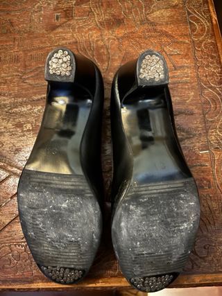 Zapatos de flamenco de la marca Osuna. - Diseño clásico. Casi sin uso. Las puntillas estan sin aplastar y la suela sin pulir. - Tira elástica para mayor sujeción. Habría que cambiarla porque con el paso del tiempo la goma se pasa. - Tacón de altura media. -Perfecto para alumnas iniciales.