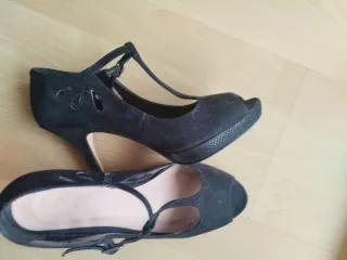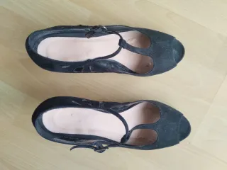 Zapato de salón. Negro de ante. Fue un regalo y le van grandes a mi madre. No los ha llevado mucho. 9cm de tacón.