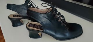 Preciosos zapatos de mujer de la marca C.Fox. Son de color negro, con tacón y cierre de cordones. Están prácticamente nuevos. - Zapatos de tacón estilo peep-toe. - Material: Piel sintética - Color: Negro. - Talla: 35/36 (se recomienda comprobar la talla antes de comprar). - Cierre con cordones.