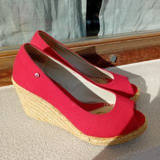 Zapatos de tacón estilo cuña en color rojo. - Diseño peep-toe. - Detalle de esparto en la suela. - Borde interior con estampado de corazones.