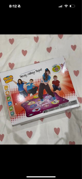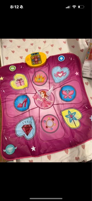 Manta de baile interactiva con temática de hadas y princesas. Ideal para que los más pequeños se diviertan. - Diseño en color rosa con ilustraciones de corazones, estrellas, coronas, zapatos de tacón, mariposas, varitas mágicas, joyas y regalos. - Módulo de control con botones y pantalla. - Incluye botón de inicio.