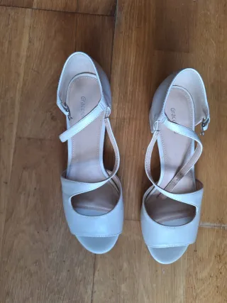 Zapatos novia piel (Fabrica de Elche, Alicante) plantilla de GEL, MUY MUY CÓMODOS. Usados una vez. Están perfectos! - Diseño abierto en la punta, con cierre de hebilla en tobillo. - Tacón altura 9cm y plataforma 2 cm. - Envío en caja original y etiquetas de fábrica-garantía de calidad. - Precio de compra (100€). VENDO VESTIDO NOVIA CORTE IMPERIO TALLA 36-38 en mi perfil.