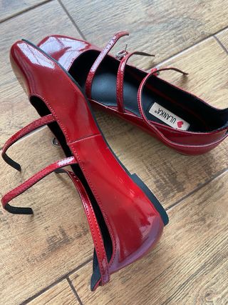 Preciosos zapatos de salón rojos de la marca ULANKA. Son de charol y tienen un diseño elegante y sofisticado. - Hebillas decorativas. - Tacón bajo.