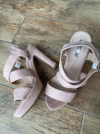 Preciosos tacones de color rosa claro, ideales para cualquier ocasión. Tienen un tacón grueso y cómodo. - Tacón alto y grueso. - Diseño de tiras cruzadas. - Material de ante. - Color rosa palo.