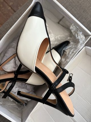 Preciosos zapatos de tacón, nuevos a estrenar. Son de dos colores, blanco y negro. - Diseño elegante y sofisticado. - Tacón alto. - Material de alta calidad. - Se venden en su caja original.