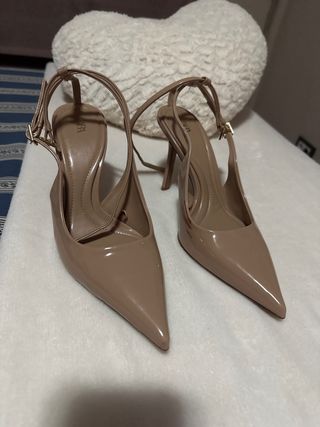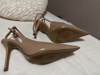 Elegantes zapatos de tacón fino con un diseño de punta afilada y tiras al tobillo. - Tacón fino y alto. - Tiras ajustables al tobillo. - Acabado brillante. se han utilizado una sola vez