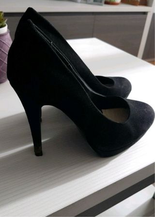 Elegantes zapatos de tacón negros con diseño peep toe. - Material exterior de ante. - Tacón de aguja. - Plataforma delantera. - Cierre con cremallera dorada en el talón.