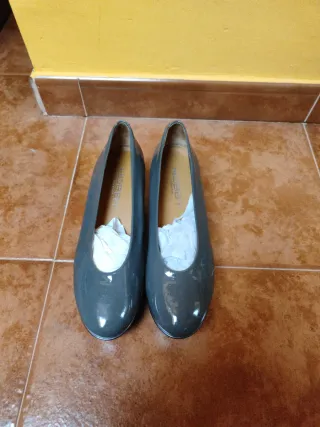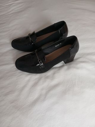 Elegantes zapatos de piel con acabado charol. Comodísimos. - Color gris y plateado. - Cierre con cordones. - Tacón grueso.