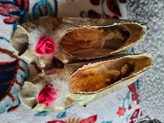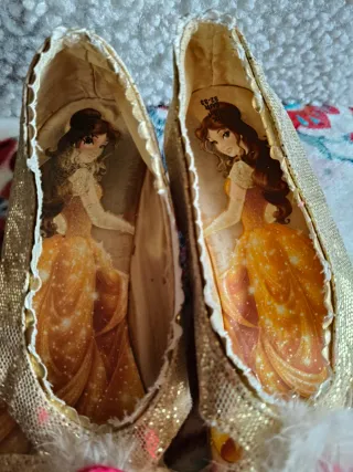 Preciosos zapatos inspirados en la princesa Bella, perfectos para ocasiones especiales o para jugar a ser princesa. Tienen un diseño brillante y detalles encantadores. - Color dorado con lentejuelas. - Adorno de lazo con flor rosa y plumas. - Interior con estampado de la princesa Bella.