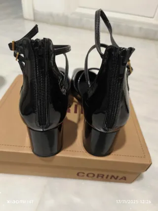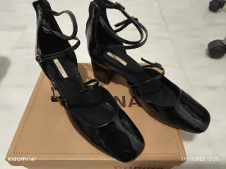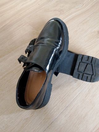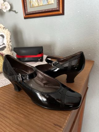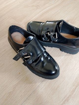 Zapatos de vestir negros de la marca Marypaz. Tienen desgaste en el recubrimiento de alguna hebilla. - Cierre con doble hebilla. - Acabado brillante. - Suela gruesa.