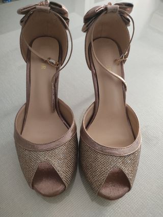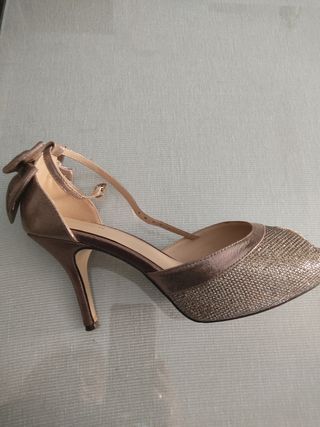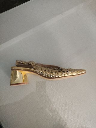 Preciosos zapatos de tacón. Son de color dorado y tienen un diseño elegante. - Tacón alto. - Diseño con abertura. - Material: piel sintética con textura. - Presenta una pequeña marca en la parte trasera (ver foto).