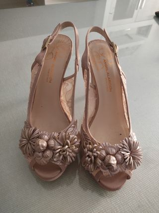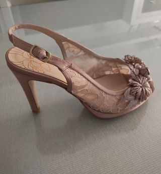 Elegantes zapatos de tacón con un diseño delicado y femenino. - Adornados con flores y encaje. - Tira ajustable en el tobillo. - Fabricados en España.