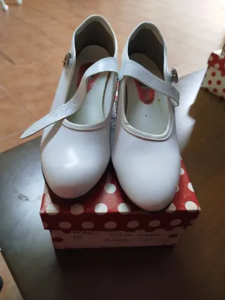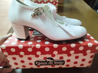 Zapatos de baile de la marca Carleti en talla 33. Ideales para la práctica de flamenco. - Color blanco. - Tacón de bloque. - Cierre de tira con hebilla.