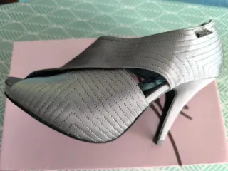 Elegante zapato de tacón con un diseño moderno. - Acabado satinado con costuras en zigzag. - Punta abierta. - Tacón fino y curvo.