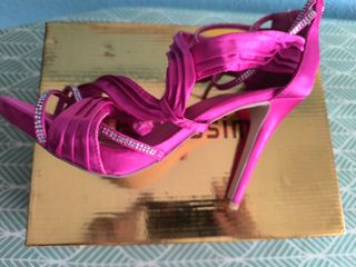 Elegantes zapatos de tacón con un vibrante color rosa y detalles que combinan a la perfección con el dorado. - Diseño de tiras adornadas con pedrería. - Tacón de aguja. - Material satinado.