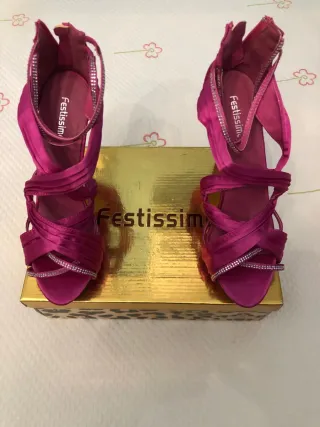 Zapatos de tacón con plumas, sin estrenar. Se abrochan en el tobillo. Talla 39, aunque tallan un pelín justo, por lo que para alguien con talla 38 o 38,5 valen, tengo su bolso a juego sin estrenar también. Se compraron para una ocasión y no se pudieron estrenar.