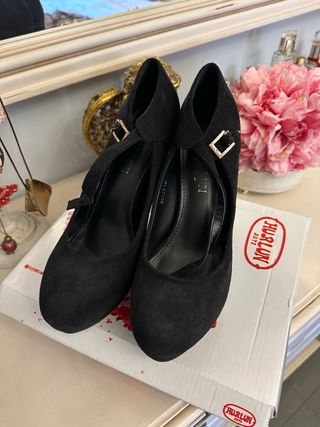 Preciosos zapatos de tacón de Zara, talla 38, en color negro. Son de ante y tienen un diseño elegante y sofisticado. - Perfectos para una ocasión especial. - Se encuentran en muy buen estado, aunque habriabque cambiarle las tapillas.