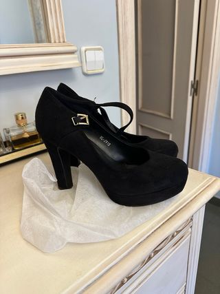 Zapatos de tacón muy altos plataforma alante ,netros con adorno muy nuevos