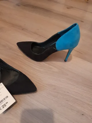 Elegantes zapatos de tacón con un diseño bicolor. Nuevos con etiquetas - Combinación de negro y azul vibrante. - Tacón fino y punta afilada.