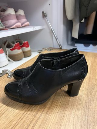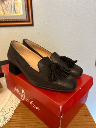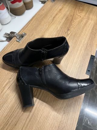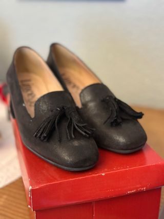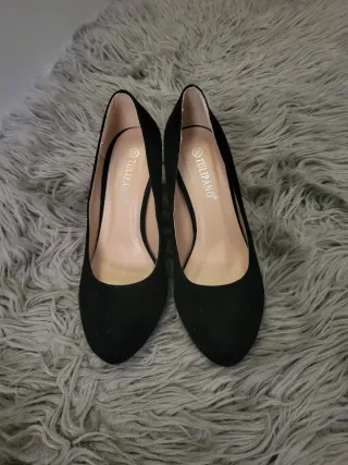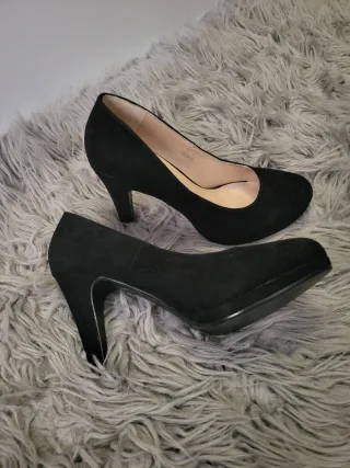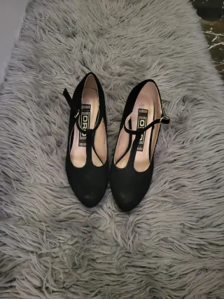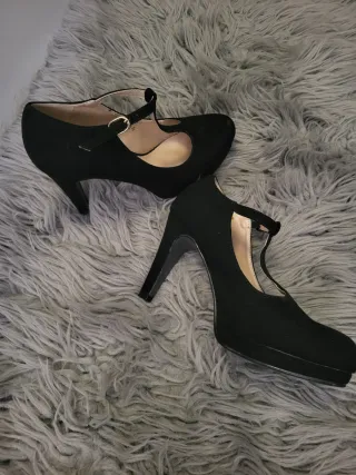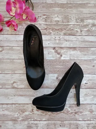 Preciosos zapatos de tacón negros, de ante. Son dos zapatos. Ideales para una ocasión especial. - Son de color negro. - Están hechos de ante. - Tienen un tacón alto. - Se encuentran en buen estado, aunque presentan un ligero desgaste por el uso.