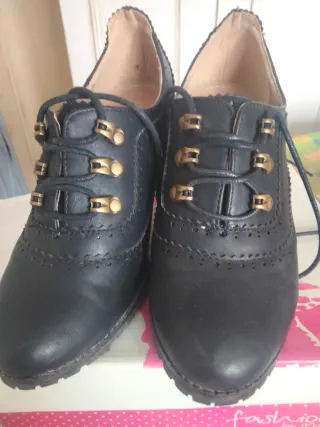 Zapatos negros con suela de plataforma gruesa. - Diseño tipo Oxford. - Cierre de cordones. - Material de ante.